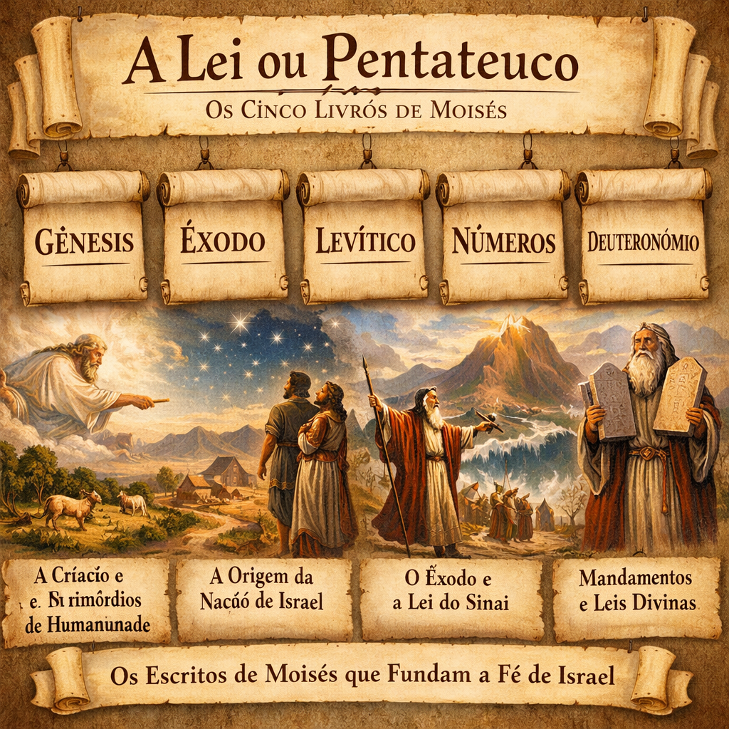 A Lei ou Pentateuco compreende os cinco primeiros livros – Gênesis, Êxodo, Levítico, Números e Deuteronômio. Escritos por Moisés, estes textos fundamentais estabelecem as bases da fé israelita, narram a criação e os primórdios da humanidade, contam a origem da nação de Israel e registram a legislação divina dada no Sinai.