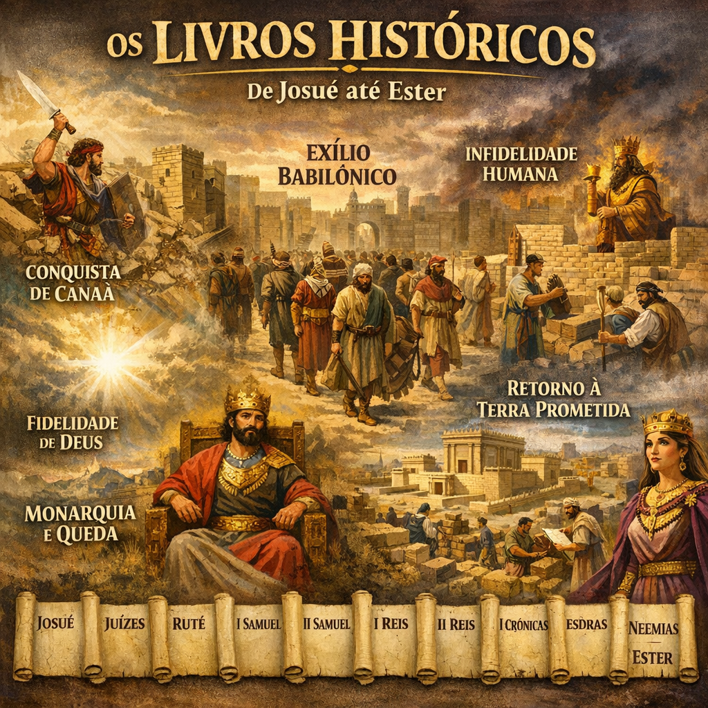 Os 12 livros históricos – de Josué até Ester – traçam a trajetória do povo escolhido desde a conquista de Canaã até o período pós-exílico. Nestas páginas, testemunhamos a fidelidade de Deus contrastando com a infidelidade humana, o estabelecimento e queda da monarquia, o exílio babilônico e o retorno à terra prometida.