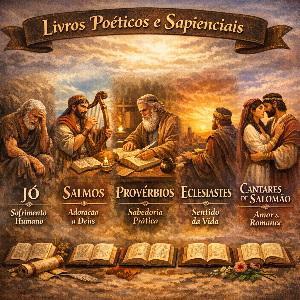Cinco livros extraordinários compõem a seção poética e sapiencial – Jó, Salmos, Provérbios, Eclesiastes e Cantares de Salomão. Escritos em forma poética hebraica, estes textos abordam as questões mais profundas da existência humana: sofrimento, adoração, sabedoria prática, sentido da vida e amor humano.]