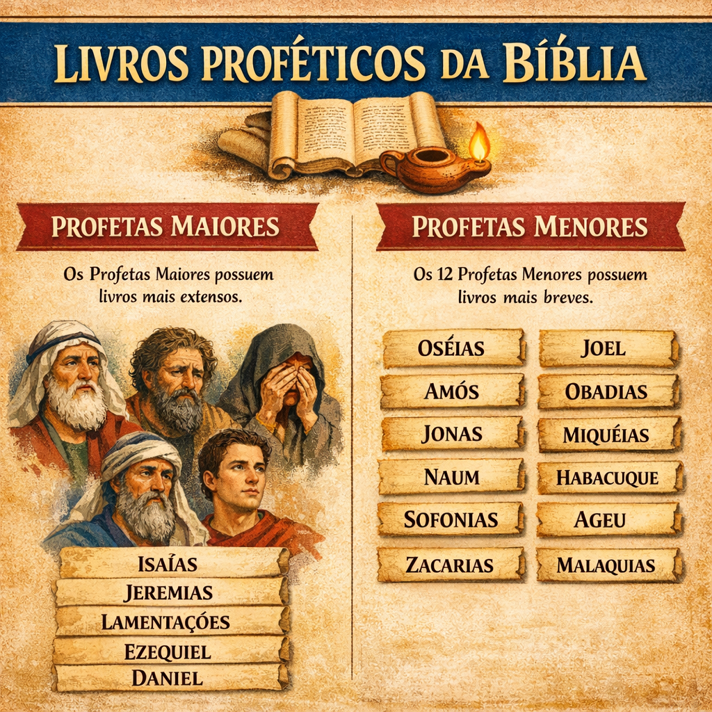 Os 17 livros proféticos dividem-se tradicionalmente entre Profetas Maiores e Menores – distinção baseada não na importância, mas na extensão dos escritos. Isaías, Jeremias, Lamentações, Ezequiel e Daniel constituem os Maiores. Os 12 Menores vão de Oséias a Malaquias.