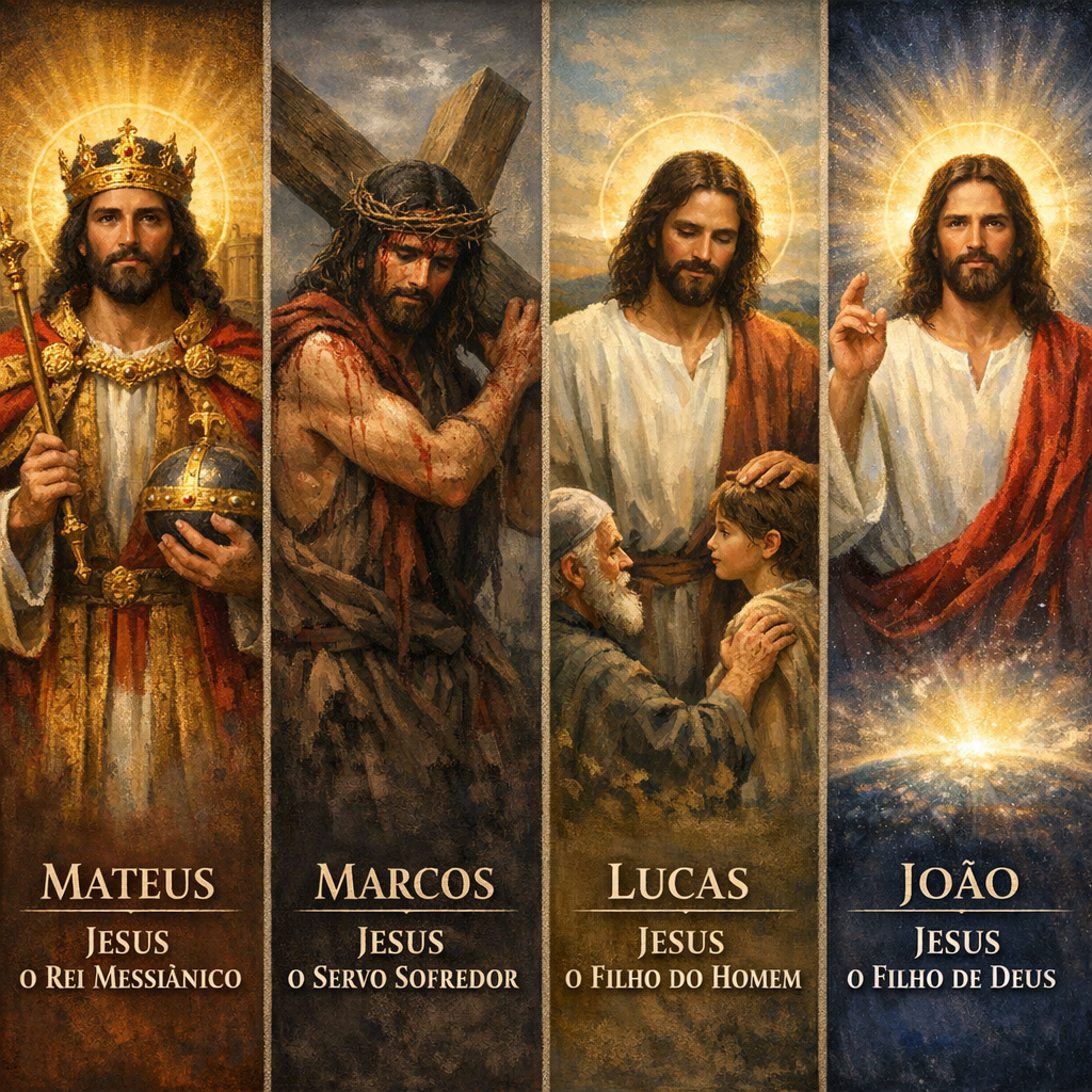 Os Quatro Evangelhos – Mateus, Marcos, Lucas e João – constituem biografias teológicas de Jesus Cristo. Cada evangelista apresenta Cristo sob perspectiva única: Mateus enfatiza Jesus como Rei messiânico, Marcos como Servo sofredor, Lucas como Filho do Homem perfeito, e João como Filho de Deus divino.