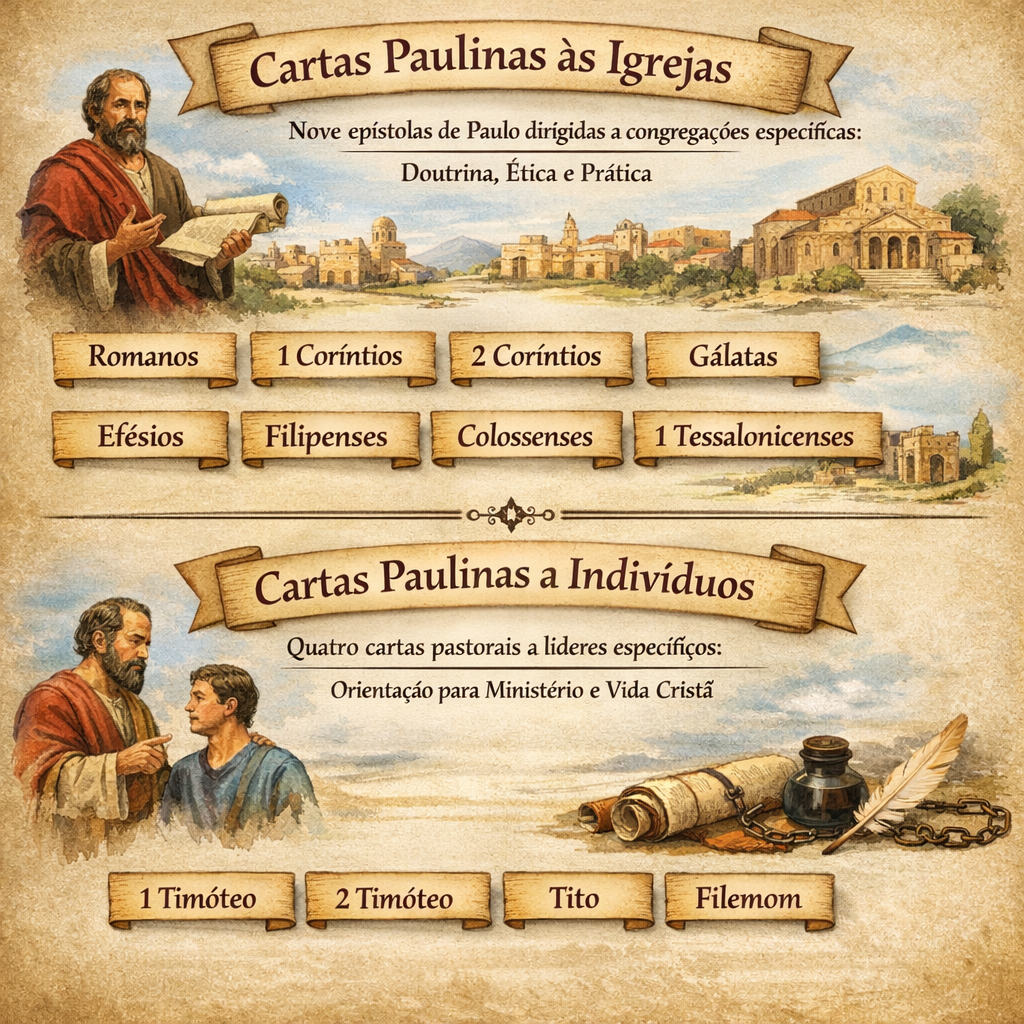 Cartas Paulinas a Indivíduos – quatro cartas pastorais a líderes específicos (1 e 2 Timóteo, Tito, Filemom), oferecendo orientação para ministério e vida cristã.