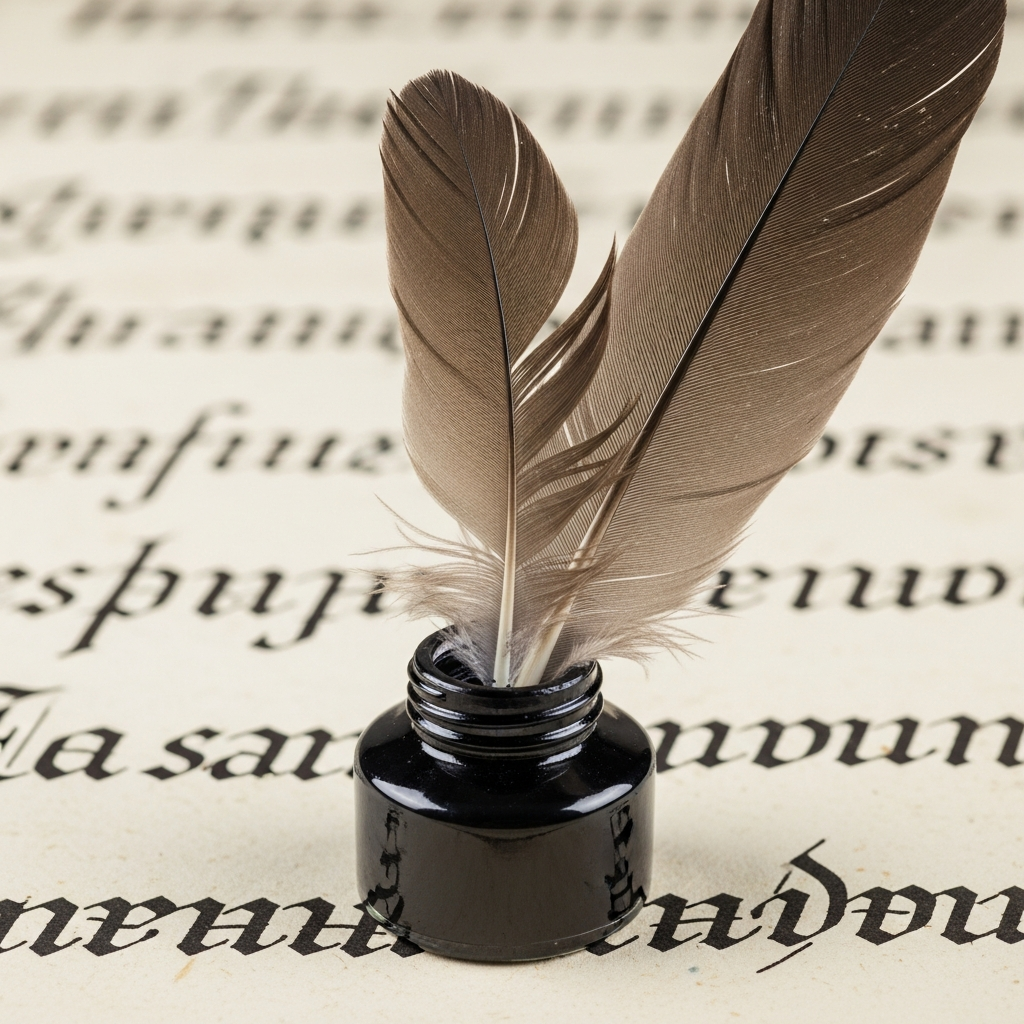 As penas de animais, especialmente de gansos, eram cortadas e moldadas para criar pontas que absorviam e liberavam tinta de forma controlada. Mergulhadas em tinteiros contendo pigmentos naturais, estas penas permitiam a escrita fluida em papiros e pergaminhos.