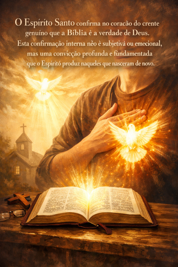O Espírito Santo confirma no coração do crente genuíno que a Bíblia é a verdade de Deus. Esta confirmação interna não é subjetiva ou emocional, mas uma convicção profunda e fundamentada que o Espírito produz naqueles que nasceram de novo.