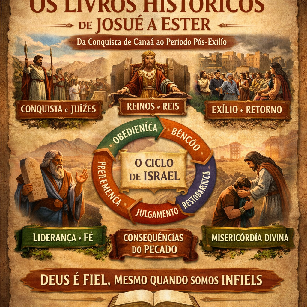 Os 12 livros históricos, que vão de Josué até Ester, narram a trajetória do povo de Israel desde a conquista de Canaã até o período pós-exílio. Esta seção histórica documenta a fidelidade de Deus às suas promessas, mesmo diante da infidelidade humana.