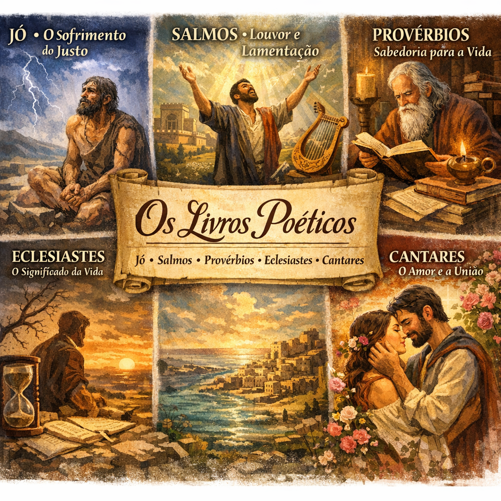 Os cinco livros poéticos — Jó, Salmos, Provérbios, Eclesiastes e Cantares — abordam temas universais da experiência humana através de uma linguagem artística e profundamente emocional. Estes escritos exploram questões como sofrimento, adoração, sabedoria prática, significado da vida e amor.