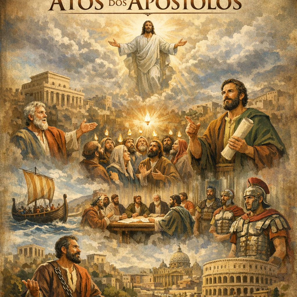 O livro de Atos, escrito por Lucas como sequência do seu evangelho, narra o nascimento e expansão da igreja cristã. Começando com a ascensão de Jesus e o Pentecostes, Atos documenta como o evangelho se espalhou de Jerusalém até Roma, cumprindo a Grande Comissão.