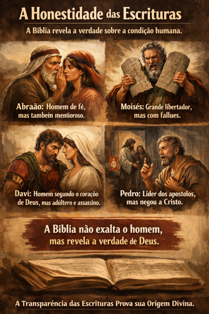 Esta imparcialidade demonstra que a origem das Escrituras não é meramente humana. Nenhum autor exaltaria deliberadamente suas próprias falhas ou as de seus heróis. A transparência bíblica revela que seu propósito não é promover homens, mas revelar a verdade sobre Deus e sobre a condição humana.