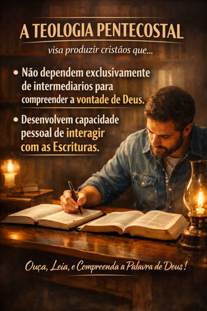A teologia pentecostal visa produzir cristãos que não dependem exclusivamente de intermediários para compreender a vontade de Deus, mas que desenvolvem capacidade pessoal de interagir com as Escrituras.