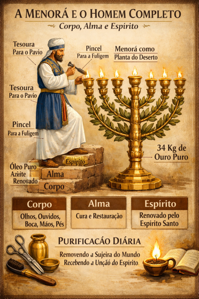 O sacerdote utilizava instrumentos específicos: tesoura para cortar o pavio queimado e pincel para remover a fuligem. Diariamente removia a sujeira acumulada e renovava o azeite. Este ritual aponta para nossa necessidade de purificação diária, removendo a contaminação do mundo e recebendo unção fresca do Espírito.