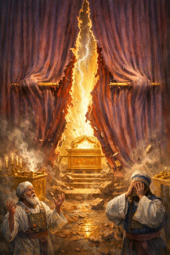 Uma cortina espessa separava o lugar santo do santíssimo. Este véu bloqueava o acesso à presença manifesta de Deus, permitindo entrada apenas ao sumo sacerdote, uma vez por ano, no Dia da Expiação.