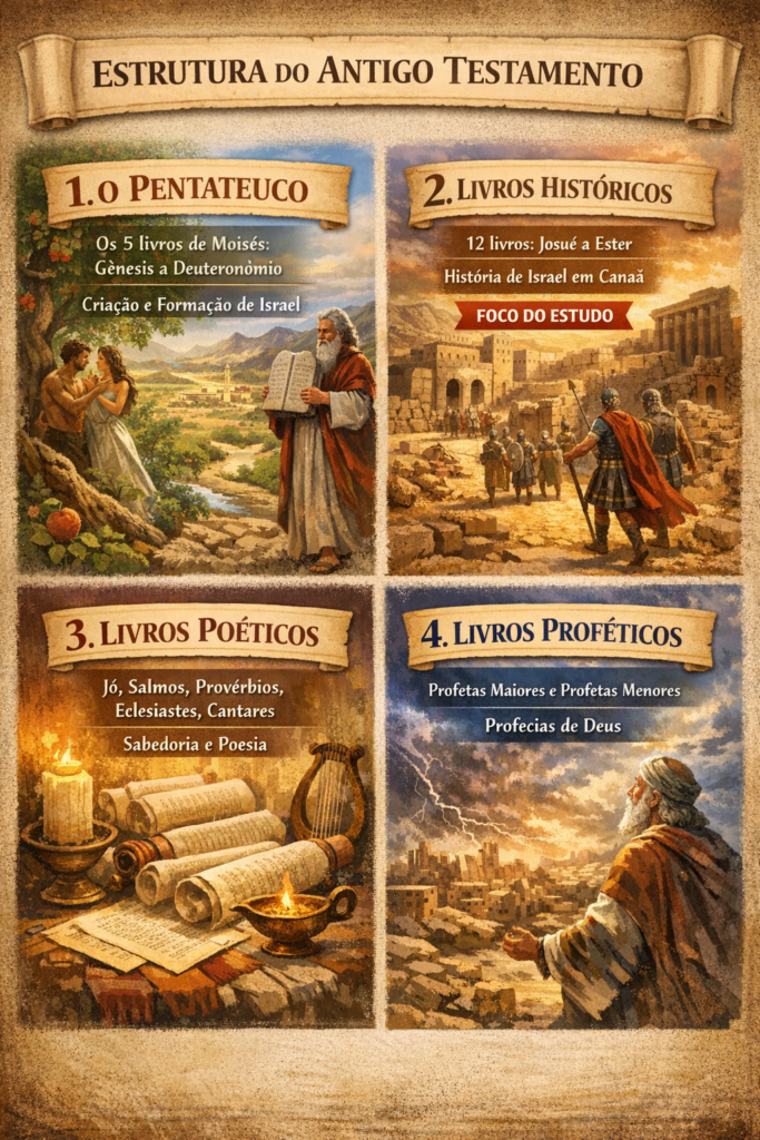 O Antigo Testamento está organizado em quatro grandes blocos de livros, cada um revelando aspectos distintos do caráter e das ações de Deus. Compreender esta estrutura é fundamental para este estudo bíblico sobre os livros históricos.