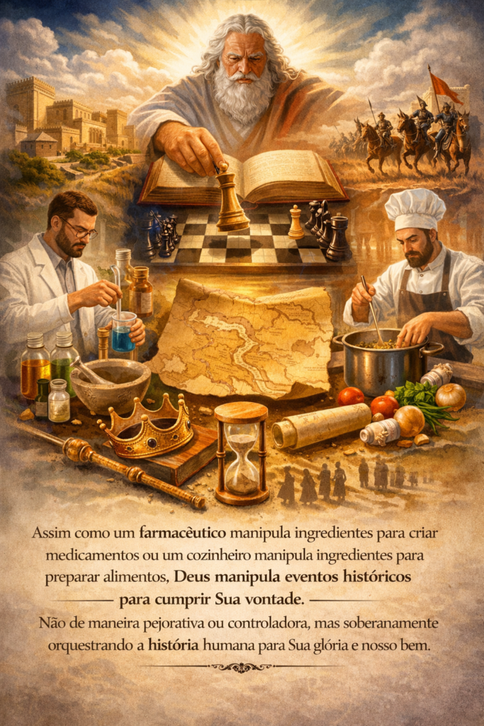 Assim como um farmacêutico manipula ingredientes para criar medicamentos ou um cozinheiro manipula ingredientes para preparar alimentos, Deus manipula eventos históricos para cumprir Sua vontade. Não de maneira pejorativa ou controladora, mas soberanamente orquestrando a história humana para Sua glória e nosso bem.