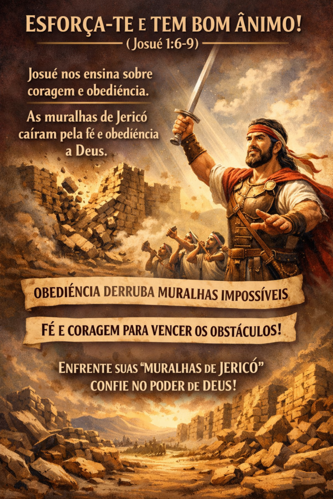 Josué nos ensina sobre coragem e obediência. Deus repetidamente ordena: “Esforça-te e tem bom ânimo” (Josué um, seis-nove). A conquista de Canaã exigia fé ousada. As muralhas de Jericó não cairiam por métodos militares convencionais, mas por obediência radical às instruções divinas.