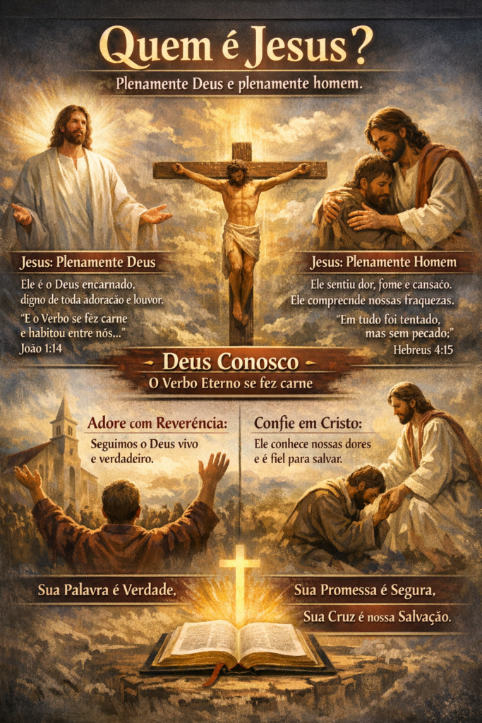Ele é plenamente divino e plenamente humano — não metade de um e metade de outro, mas cem por cento de ambos em perfeita união. Esta verdade, embora desafie nossa compreensão humana limitada, está claramente revelada nas Escrituras e confirmada pelo testemunho dos apóstolos que andaram com Jesus.