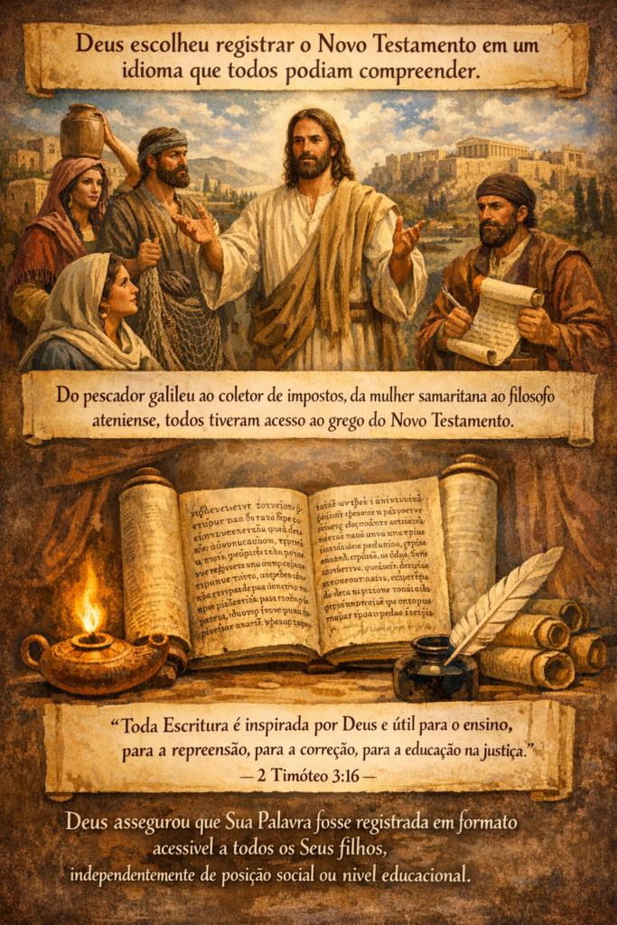 O grego koiné não é língua divina que desceu do céu, mas foi o idioma escolhido soberanamente por Deus para registrar Sua revelação final em Cristo. Era o idioma do povo comum – pescadores, coletores de impostos, comerciantes – garantindo que o Evangelho fosse acessível a todos. E esse mesmo Evangelho permanece acessível hoje a todos que desejam dedicar-se ao seu estudo.