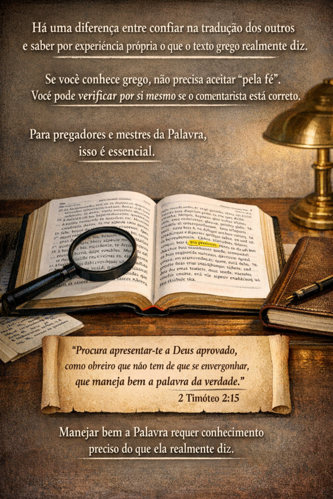 Existe diferença fundamental entre confiar na tradução de outros e saber por experiência própria o que o texto grego realmente diz. Quando você lê um comentário bíblico que afirma “no grego original, esta palavra significa…”, se você não conhece grego, deve aceitar essa afirmação pela fé. Mas se você conhece grego bíblico, pode verificar imediatamente se o comentarista está correto ou equivocado.
