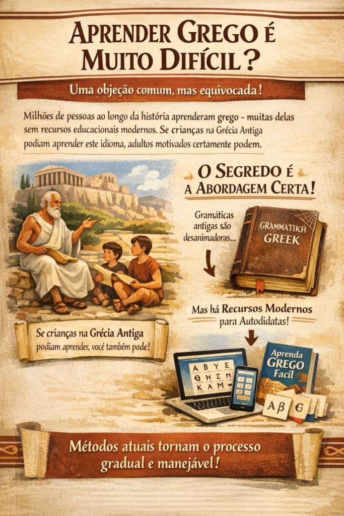 Esta é objeção mais comum, mas fundamentalmente equivocada. Milhões de pessoas ao longo da história aprenderam grego – muitas delas sem recursos educacionais modernos que possuímos hoje. Se crianças na Grécia antiga podiam aprender este idioma, adultos motivados certamente podem.