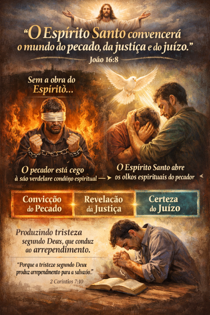Sem essa obra do Espírito, o ser humano permanece cego à gravidade de sua condição espiritual. O pecador natural não percebe a profundidade de sua rebelião contra Deus, nem sente necessidade genuína de arrependimento. É o Espírito quem abre os olhos espirituais, produzindo tristeza segundo Deus que conduz ao arrependimento (2 Coríntios 7:10).